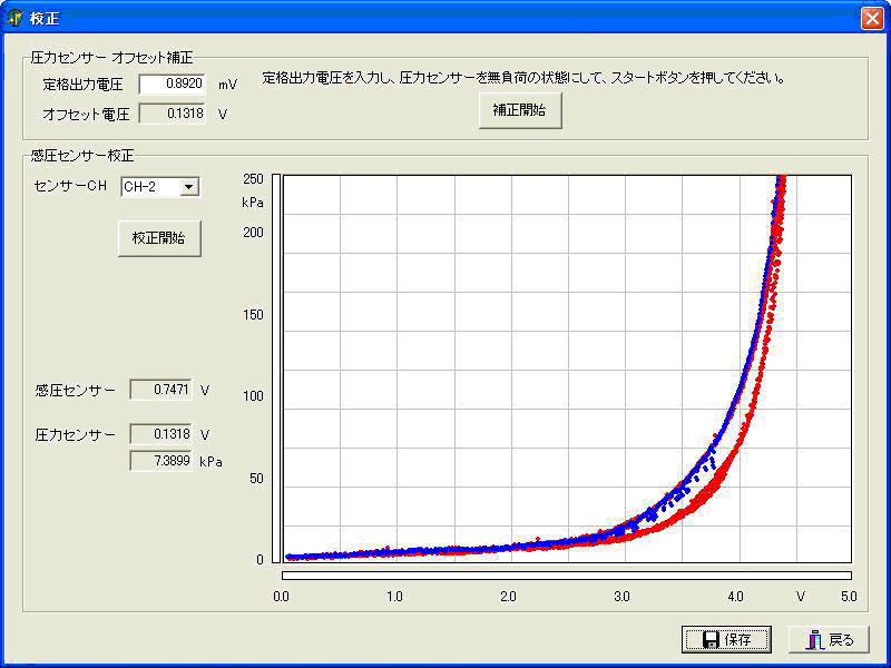 補正後の出力電圧と圧力の値をグラフ上に青丸で表示するので、内容を確認し良ければ「保存」ボタンを押して下さい。
